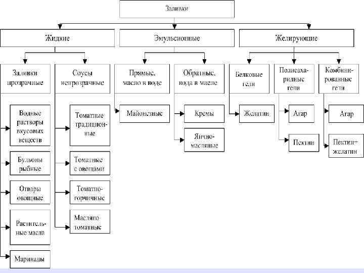 Классификация заливок • Жидкие (прозрачные и непрозрачные) • Эмульсионные (прямая и обратная эмульсия) • Желирующие (белковые, полисахаридные, комбинированные)