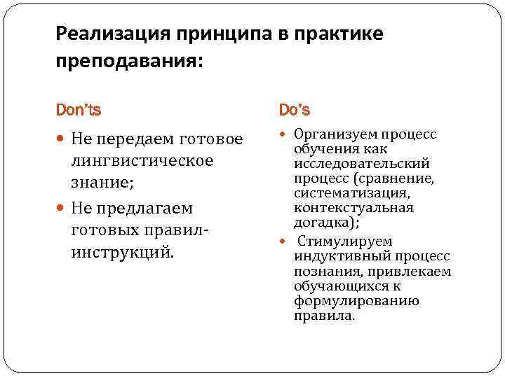 Реализация принципа в практике преподавания: Don’ts Do’s Не передаем готовое Организуем процесс лингвистическое знание; Не предлагаем готовых правилинструкций. обучения как исследовательский процесс (сравнение, систематизация, контекстуальная догадка); Стимулируем индуктивный процесс познания, привлекаем обучающихся к формулированию правила.