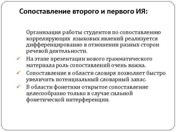 Сопоставление второго и первого ИЯ: ü ü ü Организация работы студентов по сопоставлению коррелирующих языковых явлений реализуется дифференцированно в отношении разных сторон речевой деятельности. На этапе презентации нового грамматического материала роль сопоставлений очень важна. Сопоставление в области словаря позволяет быстро увеличить потенциальный словарный запас. В области фонетики открытое сопоставление целесообразно только в случае сильной фонетической интерференции.