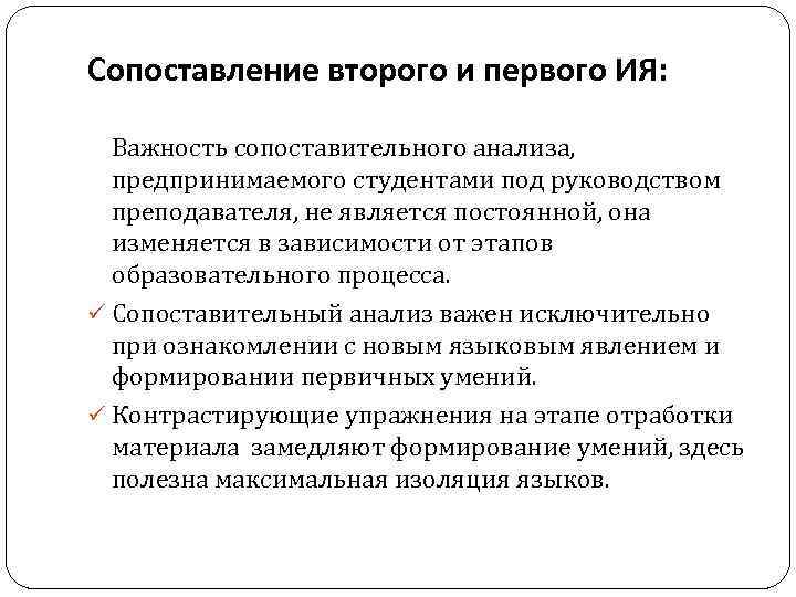 Сопоставление второго и первого ИЯ: Важность сопоставительного анализа, предпринимаемого студентами под руководством преподавателя, не является постоянной, она изменяется в зависимости от этапов образовательного процесса. ü Сопоставительный анализ важен исключительно при ознакомлении с новым языковым явлением и формировании первичных умений. ü Контрастирующие упражнения на этапе отработки материала замедляют формирование умений, здесь полезна максимальная изоляция языков.