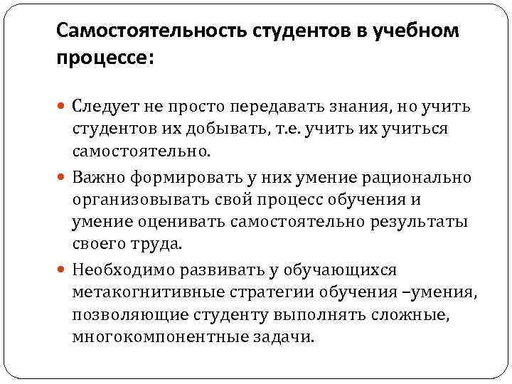 Самостоятельность студентов в учебном процессе: Следует не просто передавать знания, но учить студентов их добывать, т. е. учить их учиться самостоятельно. Важно формировать у них умение рационально организовывать свой процесс обучения и умение оценивать самостоятельно результаты своего труда. Необходимо развивать у обучающихся метакогнитивные стратегии обучения –умения, позволяющие студенту выполнять сложные, многокомпонентные задачи.