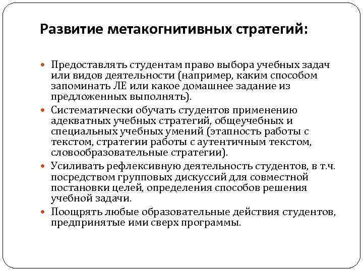 Развитие метакогнитивных стратегий: Предоставлять студентам право выбора учебных задач или видов деятельности (например, каким способом запоминать ЛЕ или какое домашнее задание из предложенных выполнять). Систематически обучать студентов применению адекватных учебных стратегий, общеучебных и специальных учебных умений (этапность работы с текстом, стратегии работы с аутентичным текстом, словообразовательные стратегии). Усиливать рефлексивную деятельность студентов, в т. ч. посредством групповых дискуссий для совместной постановки целей, определения способов решения учебной задачи. Поощрять любые образовательные действия студентов, предпринятые ими сверх программы.