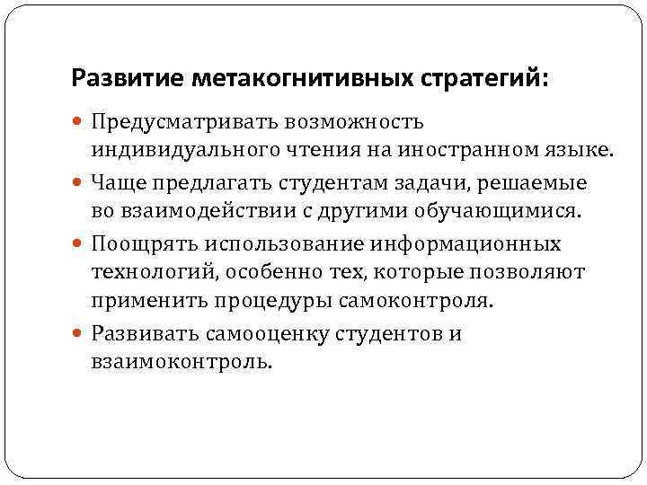 Развитие метакогнитивных стратегий: Предусматривать возможность индивидуального чтения на иностранном языке. Чаще предлагать студентам задачи, решаемые во взаимодействии с другими обучающимися. Поощрять использование информационных технологий, особенно тех, которые позволяют применить процедуры самоконтроля. Развивать самооценку студентов и взаимоконтроль.