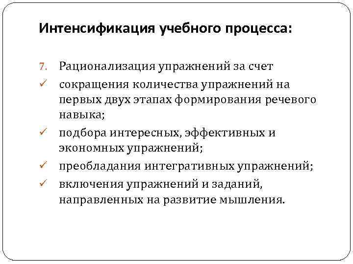 Интенсификация учебного процесса: 7. ü ü Рационализация упражнений за счет сокращения количества упражнений на первых двух этапах формирования речевого навыка; подбора интересных, эффективных и экономных упражнений; преобладания интегративных упражнений; включения упражнений и заданий, направленных на развитие мышления.
