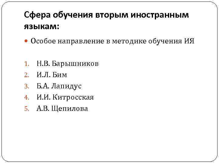 Сфера обучения вторым иностранным языкам: Особое направление в методике обучения ИЯ 1. 2. 3. 4. 5. Н. В. Барышников И. Л. Бим Б. А. Лапидус И. И. Китросская А. В. Щепилова