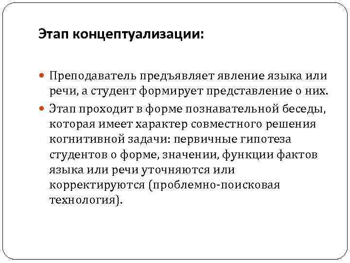 Этап концептуализации: Преподаватель предъявляет явление языка или речи, а студент формирует представление о них. Этап проходит в форме познавательной беседы, которая имеет характер совместного решения когнитивной задачи: первичные гипотеза студентов о форме, значении, функции фактов языка или речи уточняются или корректируются (проблемно-поисковая технология).