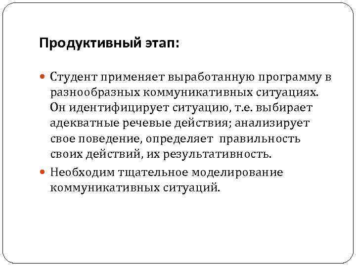 Продуктивный этап: Студент применяет выработанную программу в разнообразных коммуникативных ситуациях. Он идентифицирует ситуацию, т. е. выбирает адекватные речевые действия; анализирует свое поведение, определяет правильность своих действий, их результативность. Необходим тщательное моделирование коммуникативных ситуаций.