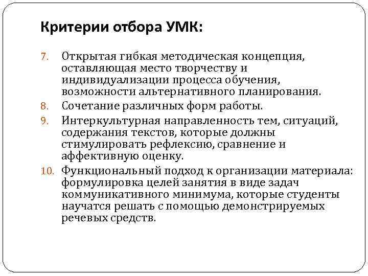 Критерии отбора УМК: Открытая гибкая методическая концепция, оставляющая место творчеству и индивидуализации процесса обучения, возможности альтернативного планирования. 8. Сочетание различных форм работы. 9. Интеркультурная направленность тем, ситуаций, содержания текстов, которые должны стимулировать рефлексию, сравнение и аффективную оценку. 10. Функциональный подход к организации материала: формулировка целей занятия в виде задач коммуникативного минимума, которые студенты научатся решать с помощью демонстрируемых речевых средств. 7.