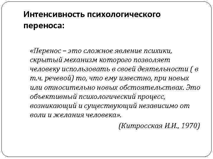 Интенсивность психологического переноса: «Перенос – это сложное явление психики, скрытый механизм которого позволяет человеку использовать в своей деятельности ( в т. ч. речевой) то, что ему известно, при новых или относительно новых обстоятельствах. Это объективный психологический процесс, возникающий и существующий независимо от воли и желания человека» . (Китросская И. И. , 1970)