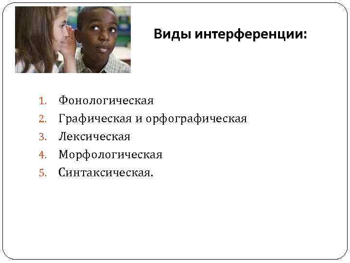 Виды интерференции: 1. 2. 3. 4. 5. Фонологическая Графическая и орфографическая Лексическая Морфологическая Синтаксическая.