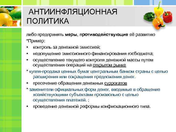 АНТИИНФЛЯЦИОННАЯ ПОЛИТИКА либо предпринять меры, противодействующие её развитию *Пример: • контроль за денежной эмиссией; • недопущение эмиссионного финансирования госбюджета; • осуществление текущего контроля денежной массы путем осуществления операций на открытом рынке * купля-продажа ценных бумаг центральным банком страны с целью расширения или сокращения предложения денег. • пресечение обращения денежных суррогатов * заменители официальных форм денег, вводимые в обращение хозяйствующими субъектами произвольно с целью осуществления платежей. ; • проведение денежной реформы конфискационного типа.