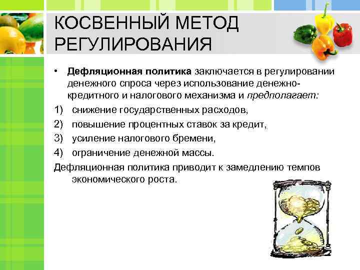 КОСВЕННЫЙ МЕТОД РЕГУЛИРОВАНИЯ • Дефляционная политика заключается в регулировании денежного спроса через использование денежнокредитного и налогового механизма и предполагает: 1) снижение государственных расходов, 2) повышение процентных ставок за кредит, 3) усиление налогового бремени, 4) ограничение денежной массы. Дефляционная политика приводит к замедлению темпов экономического роста.