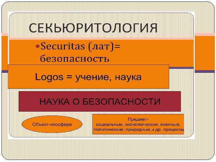 ОСНОВНЫЕ ПОДХОДЫ К БЕЗОПАСНОСТИ 1. Исходящий из объектного понимания безопасности как проявления объективной природы объектов сохранять УСТОЙЧИВОСТЬ БЕЗОПАСНОСТЬ -ОПРЕДЕЛЕННОЕ СВОЙСТВО (АТРИБУТ) СИСТЕМЫ ФОРМА САМОРЕГУЛИРОВАНИЯ СИСТЕМЫ, ПОЗВОЛЯЮЩАЯ СОХРАНИТЬ СВОЕ КАЧЕСТВО Энтропийное понимание безопасности Гомеостатическое понимание безопасности 2. 1. Исходящий из признания субъектного характера феномена безопасности