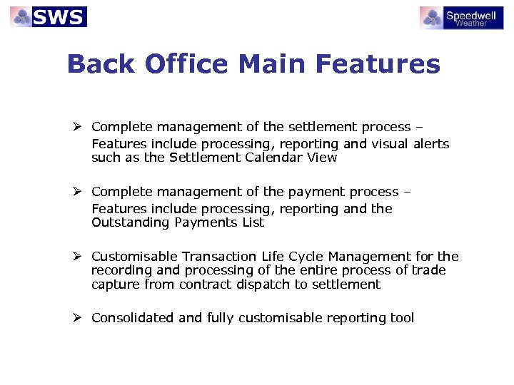 Back Office Main Features Ø Complete management of the settlement process – Features include processing, reporting and visual alerts such as the Settlement Calendar View Ø Complete management of the payment process – Features include processing, reporting and the Outstanding Payments List Ø Customisable Transaction Life Cycle Management for the recording and processing of the entire process of trade capture from contract dispatch to settlement Ø Consolidated and fully customisable reporting tool