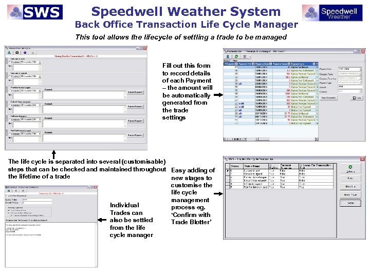 Speedwell Weather System Back Office Transaction Life Cycle Manager This tool allows the lifecycle of settling a trade to be managed Fill out this form to record details of each Payment – the amount will be automatically generated from the trade settings The life cycle is separated into several (customisable) steps that can be checked and maintained throughout Easy adding of the lifetime of a trade new stages to customise the life cycle management Individual process eg. Trades can ‘Confirm with also be settled Trade Blotter’ from the life cycle manager