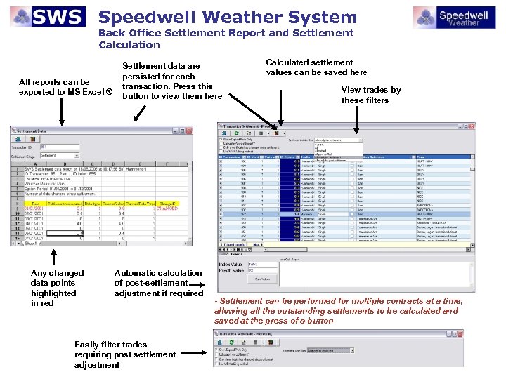 Speedwell Weather System Back Office Settlement Report and Settlement Calculation All reports can be exported to MS Excel ® Any changed data points highlighted in red Settlement data are persisted for each transaction. Press this button to view them here Automatic calculation of post-settlement adjustment if required Easily filter trades requiring post settlement adjustment Calculated settlement values can be saved here View trades by these filters - Settlement can be performed for multiple contracts at a time, allowing all the outstanding settlements to be calculated and saved at the press of a button