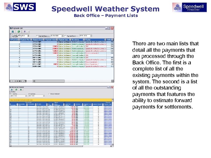 Speedwell Weather System Back Office – Payment Lists There are two main lists that detail all the payments that are processed through the Back Office. The first is a complete list of all the existing payments within the system. The second is a list of all the outstanding payments that features the ability to estimate forward payments for settlements.