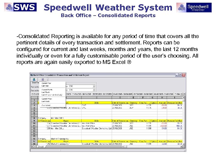 Speedwell Weather System Back Office – Consolidated Reports -Consolidated Reporting is available for any period of time that covers all the pertinent details of every transaction and settlement. Reports can be configured for current and last weeks, months and years, the last 12 months individually or even for a fully customisable period of the user’s choosing. All reports are again easily exported to MS Excel ®