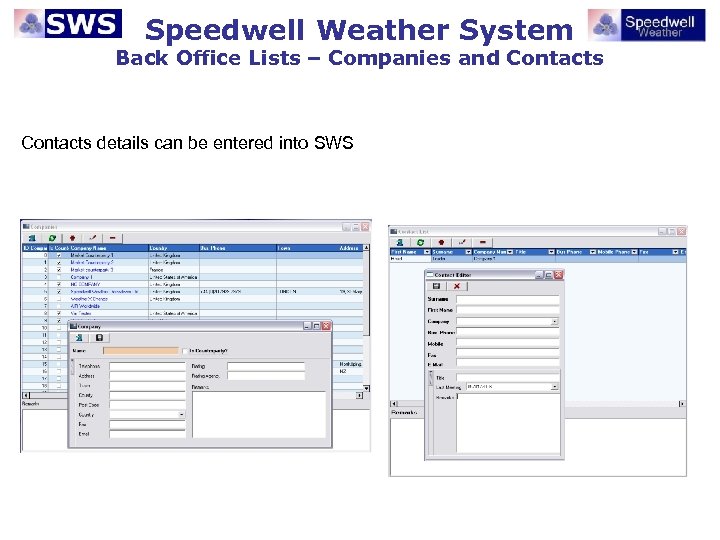 Speedwell Weather System Back Office Lists – Companies and Contacts details can be entered into SWS