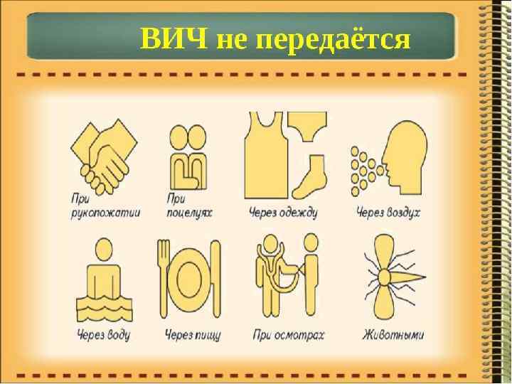 Профилактика Человек может избежать заражения ВИЧ-инфекцией, изменив свое поведение на более безопасное: - не употребляйте наркотические вещества, тем более внутривенно; - избегайте беспорядочных половых контактов; - пользуйтесь одноразовыми и стерильными инструментами для медицинских процедур; - не пользуйтесь чужими бритвами, маникюрными наборами; - берегите свое здоровье, поддерживайте чистоту тела, что предохранит вас от многих болезней.