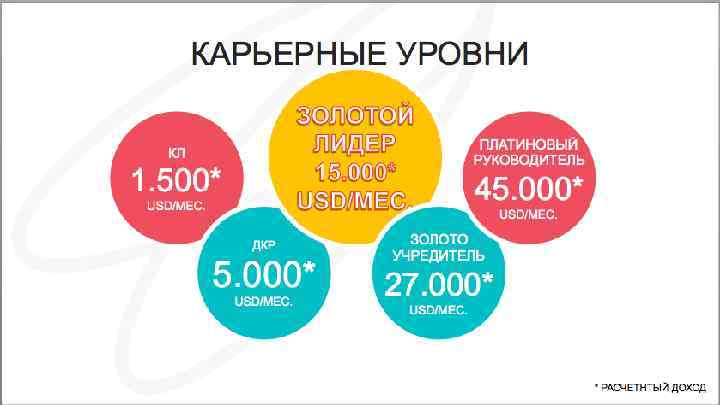 Тимохины Игорь и Катя 45000 27000 15000 1500 USD/мес. 3% 3 FRONT 5% 7% EC DEC 9% 11% Золото 13% 15% 17% 18% Золото Платина Изумруд основатель Б Р И Л Л И А Н Т