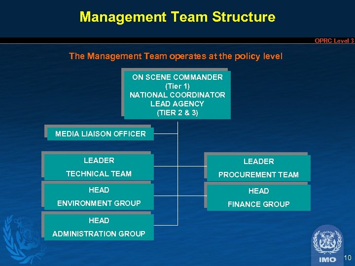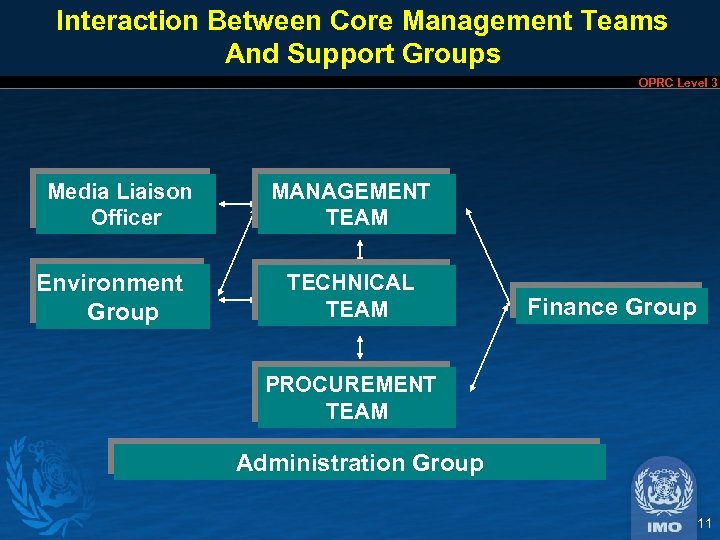 Management Team Structure OPRC Level 3 The Management Team operates at the policy level ON SCENE COMMANDER (Tier 1) NATIONAL COORDINATOR LEAD AGENCY (TIER 2 & 3) MEDIA LIAISON OFFICER LEADER TECHNICAL TEAM PROCUREMENT TEAM HEAD ENVIRONMENT GROUP FINANCE GROUP HEAD ADMINISTRATION GROUP 10