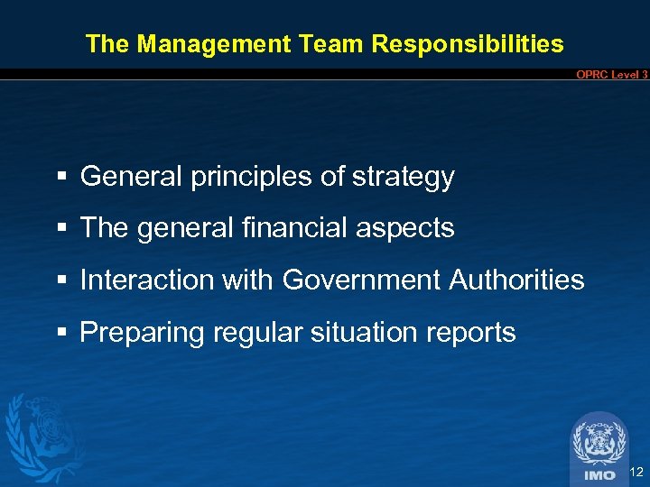 The Management Team Responsibilities OPRC Level 3 § General principles of strategy § The general financial aspects § Interaction with Government Authorities § Preparing regular situation reports 12