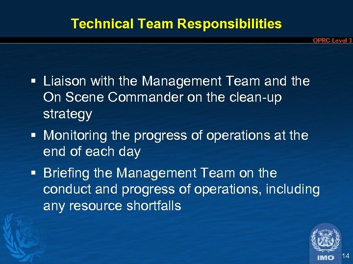 Technical Team OPRC Level 3 Head of Marine Pollution Control Dept. Leader of Procurement Team Head of Environment Group The Technical Team reports to the Management Team and is responsible for dealing with the conduct of counter pollution operations, in close consultation with the On Scene Commander. 13