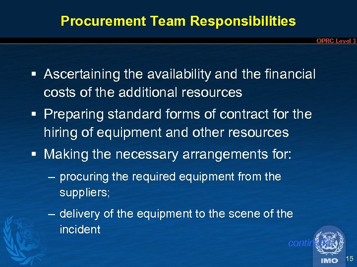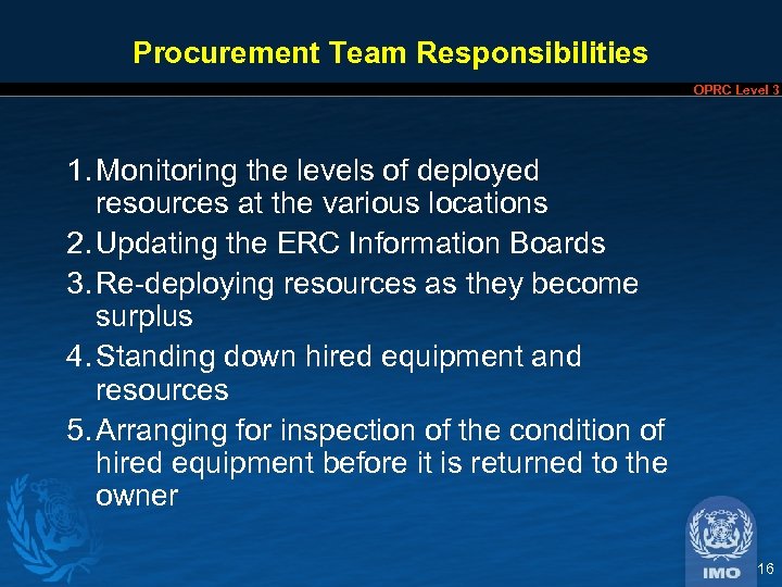 Procurement Team Responsibilities OPRC Level 3 § Ascertaining the availability and the financial costs of the additional resources § Preparing standard forms of contract for the hiring of equipment and other resources § Making the necessary arrangements for: – procuring the required equipment from the suppliers; – delivery of the equipment to the scene of the incident continued. 15