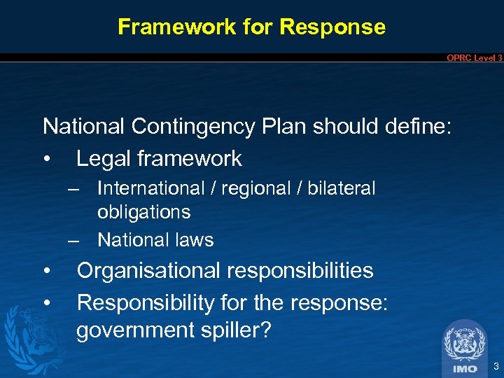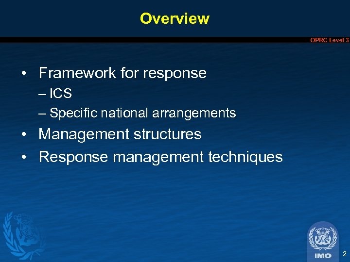 Overview OPRC Level 3 • Framework for response – ICS – Specific national arrangements • Management structures • Response management techniques 2