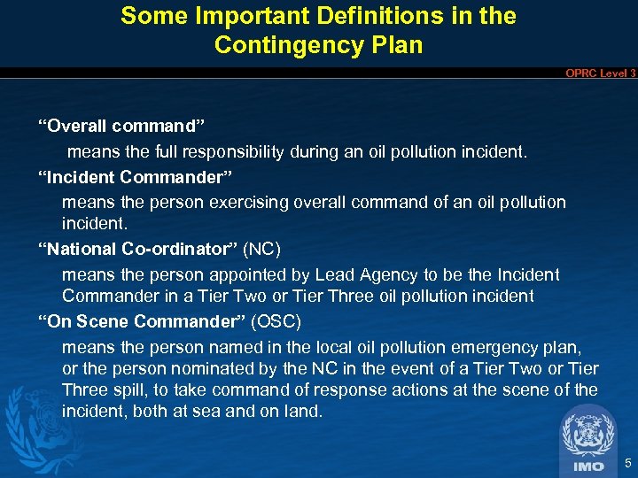Organisational Responsibilities OPRC Level 3 • Competent national authority(ies) with responsibility for preparedness & response: – at sea? – on shore? – chemicals? oil? • Operational contact point – receipt/transmission of pollution reports • Authority to request / render assistance 4