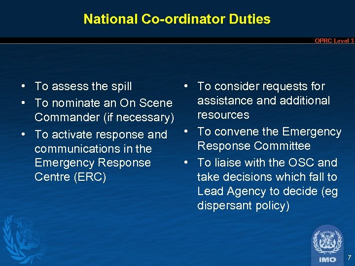 The Incident Commander OPRC Level 3 § Tier 1 Incident Commander = The On Scene Commander § Tier 2 Incident Commander = The National Co-ordinator § Tier 3 Incident Commander = The National Co-ordinator 6