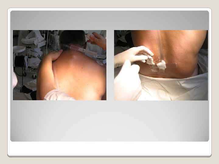 Противопоказания: ◦ Отсутствие необходимых условий и оснащения для полноценного наблюдения за состоянием больного во время анестезии и эффективного лечения потенциально возможных осложнений. ◦ Шок ◦ Гипотония, гиповолемия ◦ Внутричерепная гипертензия ◦ Заболевания нервной системы (менингит, арахноидит) ◦ Инфекция кожи в области пункции ◦ Сепсис ◦ Бактериемия ◦ Тяжелая интоксикация ◦ Заболевания ССС в стадии декомпенсации ◦ Выраженные признаки ваготонии, частые синкопальные состояния в анамнезе, синдром слабости синусового узла, AVблокады ◦ Анатомические аномалии позвоночника ◦ Коагулопатии ◦ Повышенная чувствительность к анестетику