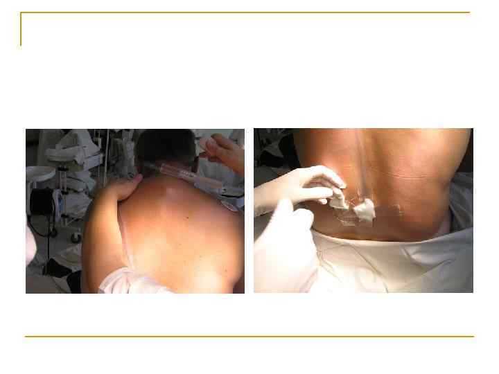 Осложнения: n n Повреждение сосудов субдурального и субарахноидального пространства ( лечение - немедленно извлечение) Резкое снижение АД ( лечение – инфузионная терапия, адреналин, допамин) Угнетение дыхания ( лечение – оксигенотерапия, ИВЛ) Аллергические реакции