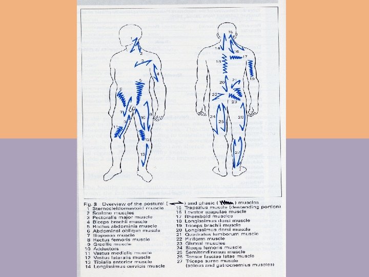 Патофизиология мышечного сокращения (J. Dvorak, V. Dvorak, 1991) - Скелетные мышцы человека состоят из тысяч миофибрилл. Одна миофибрилла по тонкости сопоставима с волосом и достигает длины 10 – 15 см. - Миофибриллы делятся на I (медленный) и II (быстрый) типы - Постуральная (тоническая) мускулатура преимущественно состоит из миофибрилл I типа. В ней преобладает аэробный тип окисления, в качестве энергетического субстрата используется гликоген и жир. Продукция молочной кислоты достаточно мала - Основная функция постуральной мускулатуры – поддержание позы