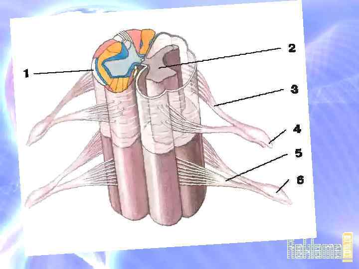 Передние корешки спинного мозга (лат. radix ventralis, radix anterior) • Из переднелатеральной борозды или вблизи неё выходят передние корешковые нити (лат. fila radicularia), представляющие собой аксоны нервных клеток. Передние корешковые нити образуют передний (двигательный) корешок (лат. radix ventralis, radix anterior). Передние корешки содержат центробежные эфферентные волокна, проводящие двигательные импульсы на периферию тела: к поперечно-полосатым и гладким мышцам, к внутр. органам, железам и др.