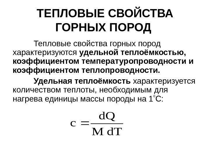 ТЕПЛОВЫЕ СВОЙСТВА ГОРНЫХ ПОРОД Тепловые свойства горных пород характеризуются удельной теплоёмкостью, коэффициентом температуропроводности и коэффициентом теплопроводности. Удельная теплоёмкость характеризуется количеством теплоты, необходимым для нагрева единицы массы породы на 1 С: d. TM d. Q c