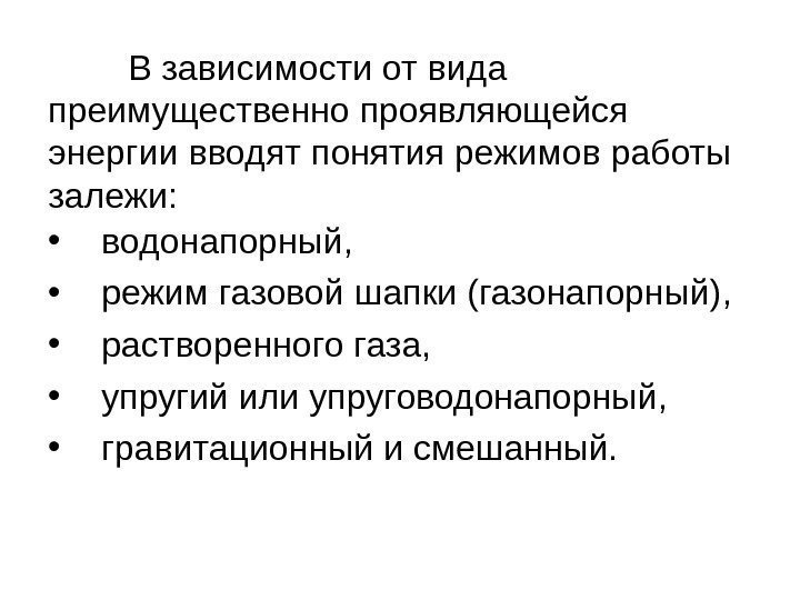 В зависимости от вида преимущественно проявляющейся энергии вводят понятия режимов работы залежи: • водонапорный, • режим газовой шапки (газонапорный), • растворенного газа, • упругий или упруговодонапорный, • гравитационный и смешанный.