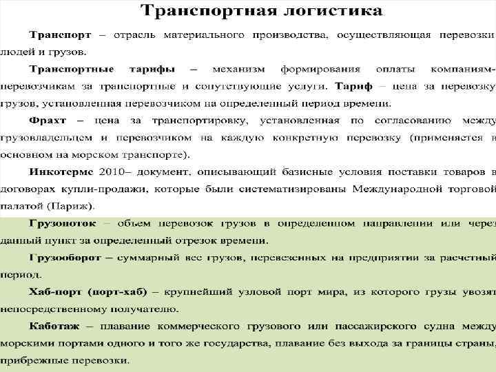 Факторы, которые способствовали развитию логистики 1. Превращение рынка продавцов в рынок покупателей. 2. Новый уровень международных отношений. 3. Появление и распространение современных компьютеров. 4. Новые достижения в транспорте и связи. 5. Изменение структуры, усложнение состава и свойств изделий. 6. Создание гибких производственных систем. 7. Резкое снижение себестоимости товара. 8. Повышение надежности и качества поставок. 9. Распространение международного разделения труда. 10. Новые достижения в науке. 11. Затраты на продвижение МП составляют до 80 % конечной цены товара. 12. Унификация правил и норм по поставке товаров во внешнеэкономической деятельности. 13. Энергетический кризис 70 х годов XX века. 14. Достижение предела эффективности производства. 15. Опыт экономики СССР.