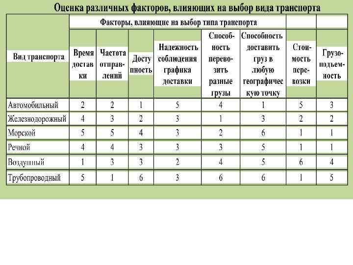 Авто мобиль ный Высокая скорость доставки. Малая грузоподъемность. Возможность использования Зависимость от погодных и дорожных различных маршрутов и схем условий. доставки. Высокая сохранность груза. Относительно высокая себестоимость Возможность отправки груза перевозок на большие расстояния. маленькими партиями. Возможность хищения груза и угона Широкие возможности выбора автотранспорта. наиболее подходящего перевозчика. Недостаточная экологическая чистота. Высокая маневренность. Обеспечивает регулярность поставки. Наивысшая скорость доставки груза. Наивысшие тарифы среди других видов Высокая надежность. транспорта. Наивысшая сохранность груза. Высокая капиталоемкость, материало и Воздуш Наиболее короткие маршруты энергоемкость перевозок. Ный перевозок. Возможность достижения Зависимость от погодных условий. отдаленных районов. Недостаточная географическая доступность. Низкая себестоимость. Большие капиталовложения. Высокая производительность Ограниченность видов груза (газ, Трубо (пропускная способность). нефтепродукты, эмульсии сырьевых провод Высокая сохранность груза. материалов, вода). Недостаточная ный Низкая капиталоемкость. доступность малых объемов транспортируемых грузов.