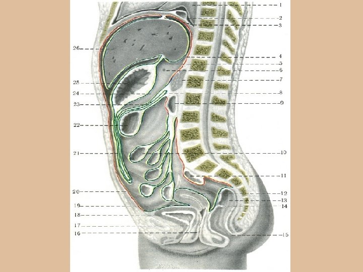 Брюшина Серозная оболочка, выстилающая брюшную полость и покрывающей внутренние органы, расположенные в этой полости. Образована: 1) собственно пластинкой серозной оболочки и 2) однослойным плоским эпителием (мезотелием). Представляет собой непрерывный листок, переходящий со стенок брюшной полости, ограничивает, на органы и с органов на ее стенки. которую • Париетальная брюшина – выстилает стенки брюшной полости; • Висцеральная брюшина – покрывает органы, находящиеся в брюшной полости Брыжейка – удвоение (дупликатура) брюшины при переходе ее на некоторые внутрибрюшинно лежащие органы: желудок, тонкая и ободочная кишка, печень,