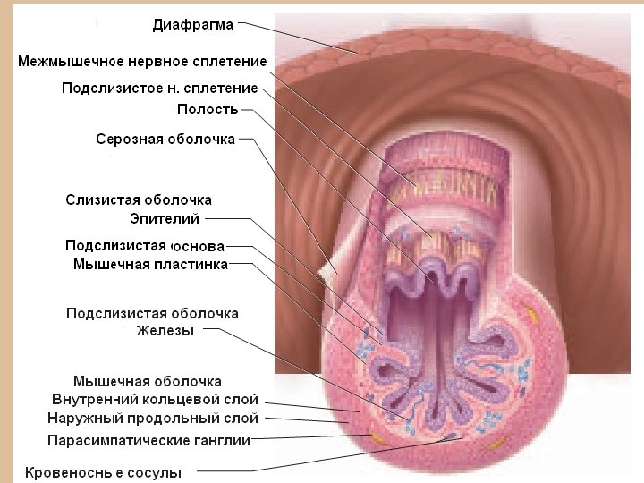 Сокращение гладких мышц пищеварительного канала и секреторная активность желез слизистой и подслизистой оболочек контролируется нервными сплетениями: • подслизистое сплетение (Мейснера) • межмышечное сплетение (Ауэрбаха)
