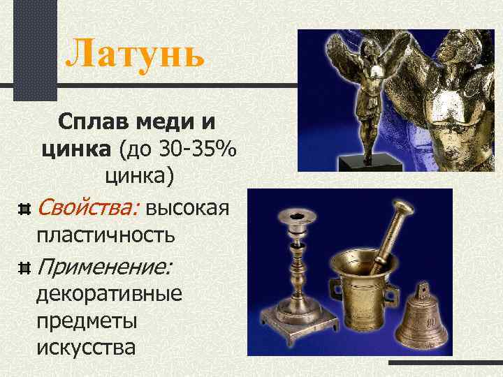 Латунь Сплав меди и цинка (до 30 -35% цинка) Свойства: высокая пластичность Применение: декоративные предметы искусства