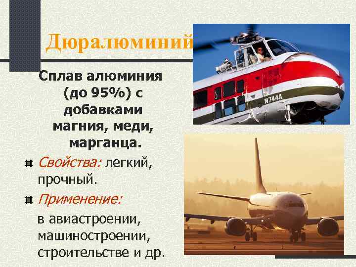 Дюралюминий Сплав алюминия (до 95%) с добавками магния, меди, марганца. Свойства: легкий, прочный. Применение: в авиастроении, машиностроении, строительстве и др.