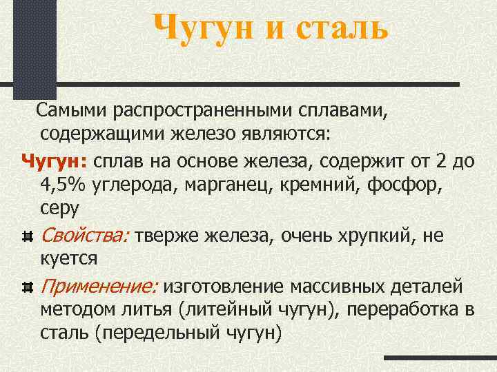 Чугун и сталь Самыми распространенными сплавами, содержащими железо являются: Чугун: сплав на основе железа, содержит от 2 до 4, 5% углерода, марганец, кремний, фосфор, серу Свойства: тверже железа, очень хрупкий, не куется Применение: изготовление массивных деталей методом литья (литейный чугун), переработка в сталь (передельный чугун)