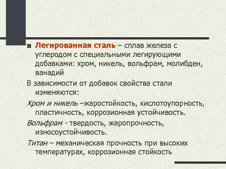 Легированная сталь – сплав железа с углеродом с специальными легирующими добавками: хром, никель, вольфрам, молибден, ванадий В зависимости от добавок свойства стали изменяются: Хром и никель –жаростойкость, кислотоупорность, пластичность, коррозионная устойчивость. Вольфрам - твердость, жаропрочность, износоустойчивость. Титан – механическая прочность при высоких температурах, коррозионная стойкость