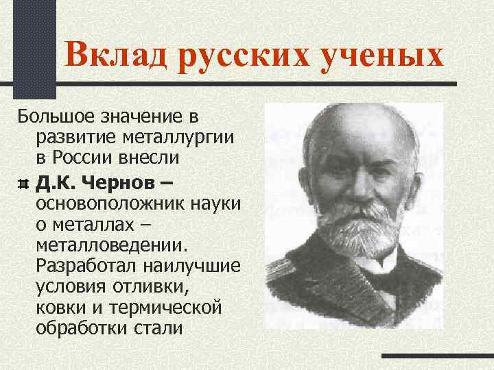 Вклад русских ученых Большое значение в развитие металлургии в России внесли Д. К. Чернов – основоположник науки о металлах – металловедении. Разработал наилучшие условия отливки, ковки и термической обработки стали