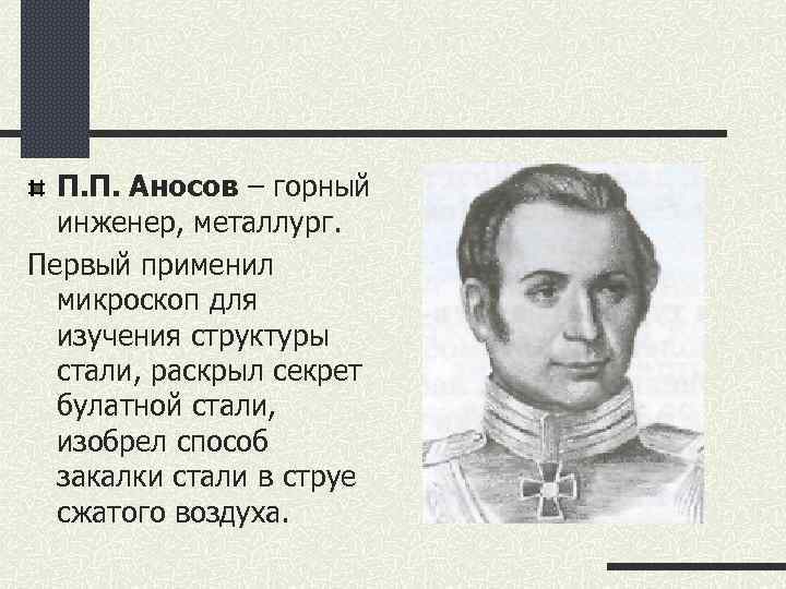 П. П. Аносов – горный инженер, металлург. Первый применил микроскоп для изучения структуры стали, раскрыл секрет булатной стали, изобрел способ закалки стали в струе сжатого воздуха.