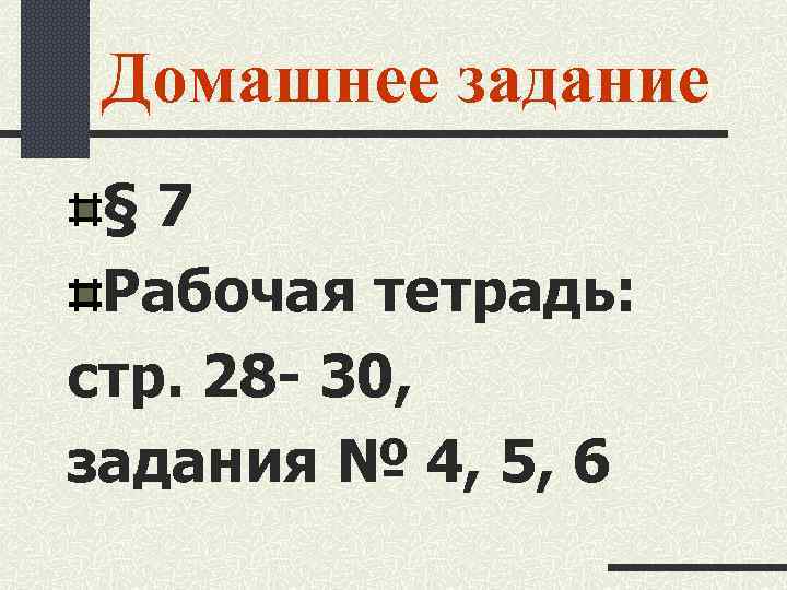 Домашнее задание § 7 Рабочая тетрадь: стр. 28 - 30, задания № 4, 5, 6