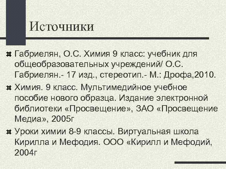 Источники Габриелян, О. С. Химия 9 класс: учебник для общеобразовательных учреждений/ О. С. Габриелян. - 17 изд. , стереотип. - М. : Дрофа, 2010. Химия. 9 класс. Мультимедийное учебное пособие нового образца. Издание электронной библиотеки «Просвещение» , ЗАО «Просвещение Медиа» , 2005 г Уроки химии 8 -9 классы. Виртуальная школа Кирилла и Мефодия. ООО «Кирилл и Мефодий, 2004 г